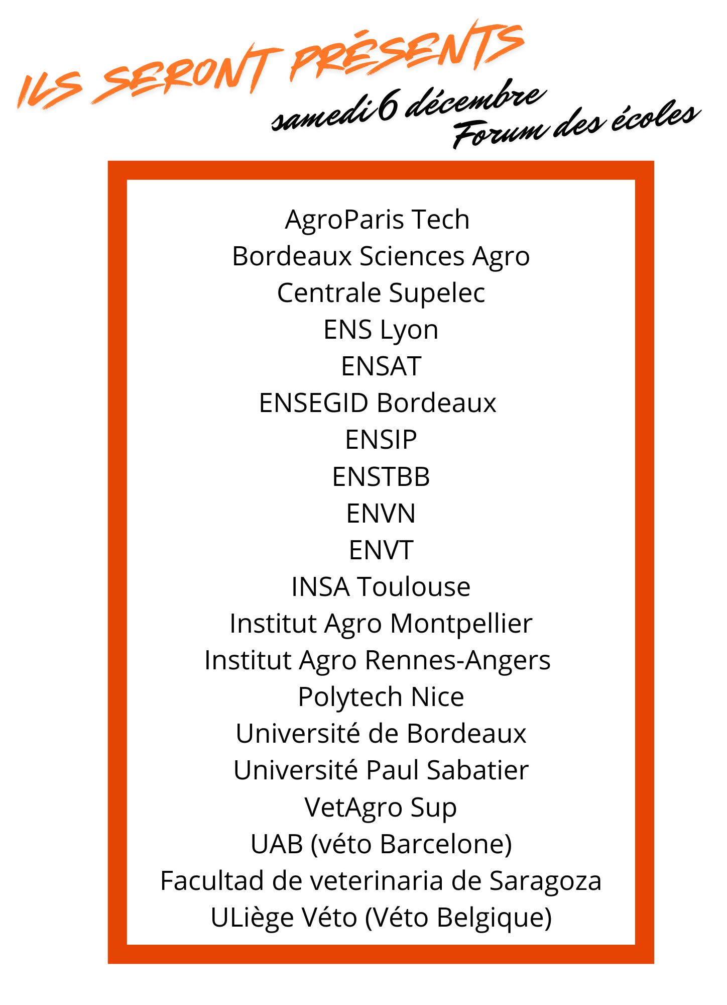 Vous trouverez en pj la liste des écoles présentes ce samedi 6 décembre après-midi. Venez rencontrer leurs ambassadeurs